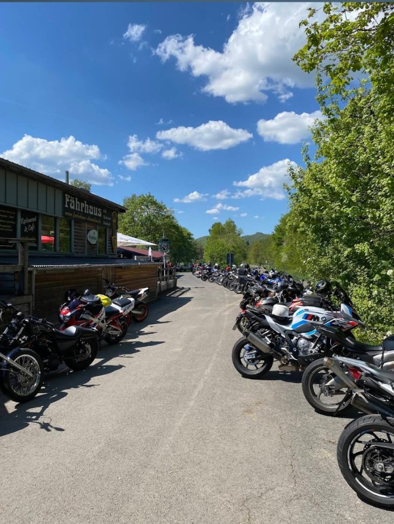 Nach der Motorradtour perfekter Stopp: Bikercafé oben, herzhaftes Essen und kühle Getränke unten.